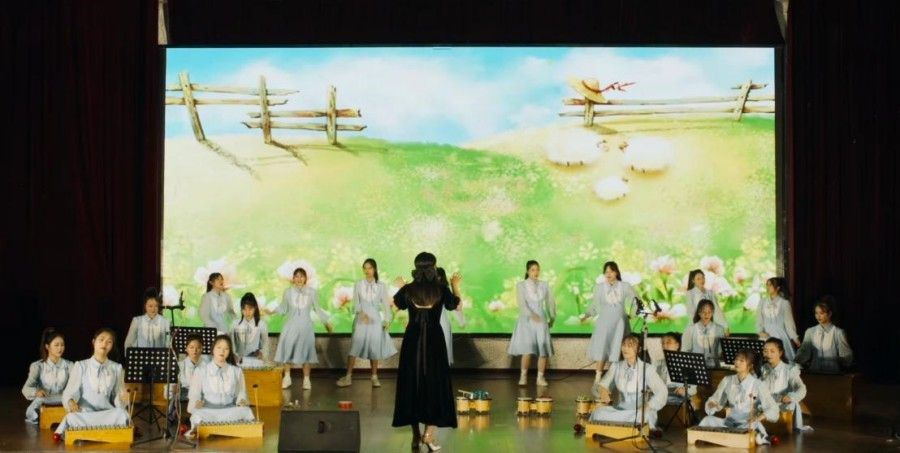 此次汇报演出分为奥尔夫音乐游戏、奥尔夫器乐演奏、乐团小合唱三个篇章,节目全部由学前教育专业奥尔夫音乐乐团的学生精心排演而来,工作室指导教师承担指挥或部分演奏工作,师生同台展示奥尔夫音乐工作室开展奥尔夫音乐教学所取得的阶段性成果。汇报演出在现场展示的同时也通过直播方式向社会开放观摩,直播平台在线观看人数达到1300多人,互动活跃。