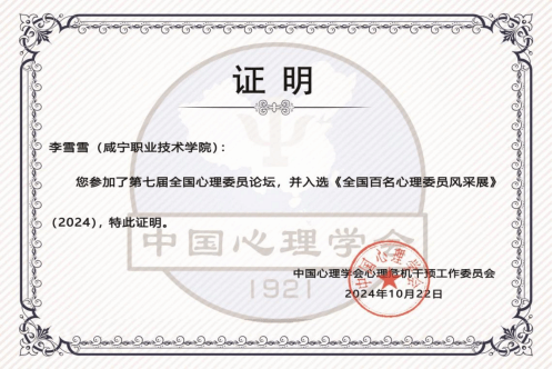 李雪雪的入选不仅是对她个人努力的肯定,也是对我院心理健康教育工作的认可。她用自己的实际行动诠释了心理健康教育工作的重要性和意义,为我院乃心理育人工作树立了榜样。