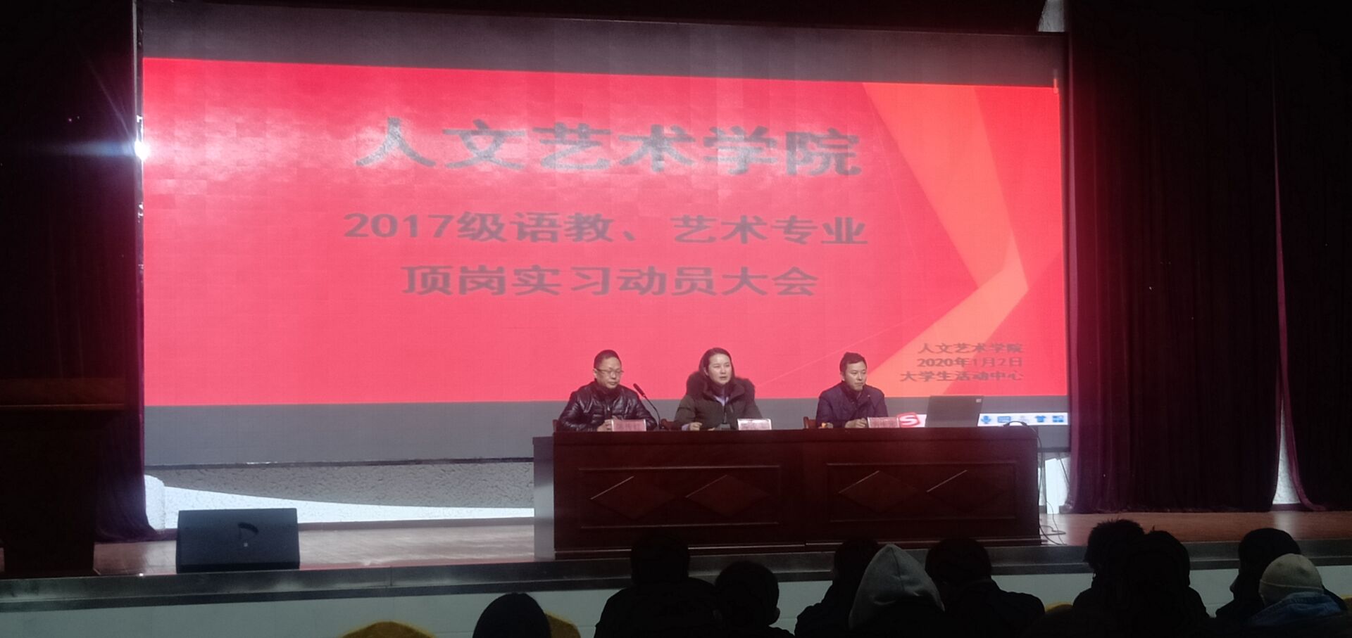 2020年1月4日,亚洲无码人妻举行2017级小教、语教、艺术专业教育实习表彰暨顶岗实习动员大会。亚洲无码人妻副院长方朝阳、就业科科长方生元、学生科科长陈传红、各专业教研室主任、实习指导教师、辅导员以及三个专业全体学生参加了本次动员大会。会议由亚洲无码人妻传信创业科科长方生元主持。