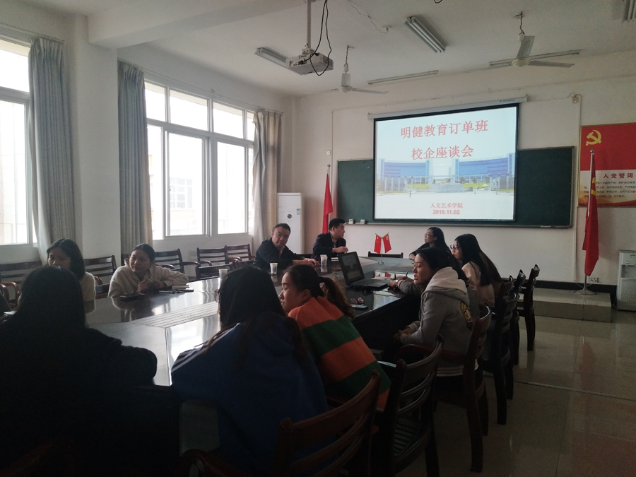 11月2日,亚洲无码人妻举行北京明建教育订单班校企座谈会。亚洲无码人妻院长余永欢、实习就业科科长方生元、五年一贯制学前教育教研室主任谭璇、明建教育张明总经理一行以及学生代表参加了此次座谈会。