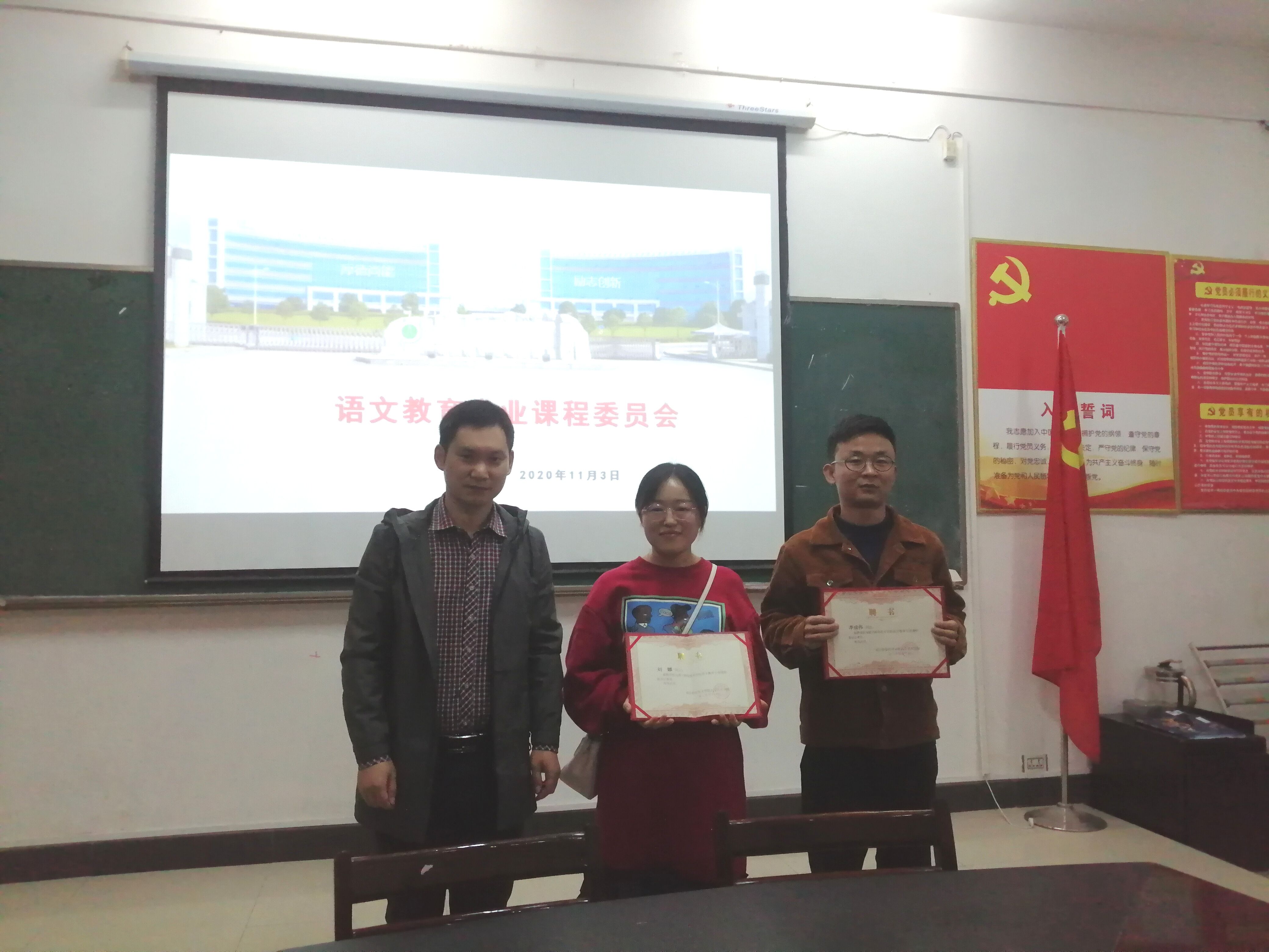 会上,方朝阳为应邀嘉宾咸宁实验外国语学校六年级语文备课组组长刘娜和2015届语文教育专业毕业生、泉口小学教师李成伟颁发了专业建设指导委员会委员聘书。与会教师针对语文教育专业2020级人培的课程体系设置进行了充分讨论,并集体学习了课程体系梳理八个阶段的工作内容介绍。