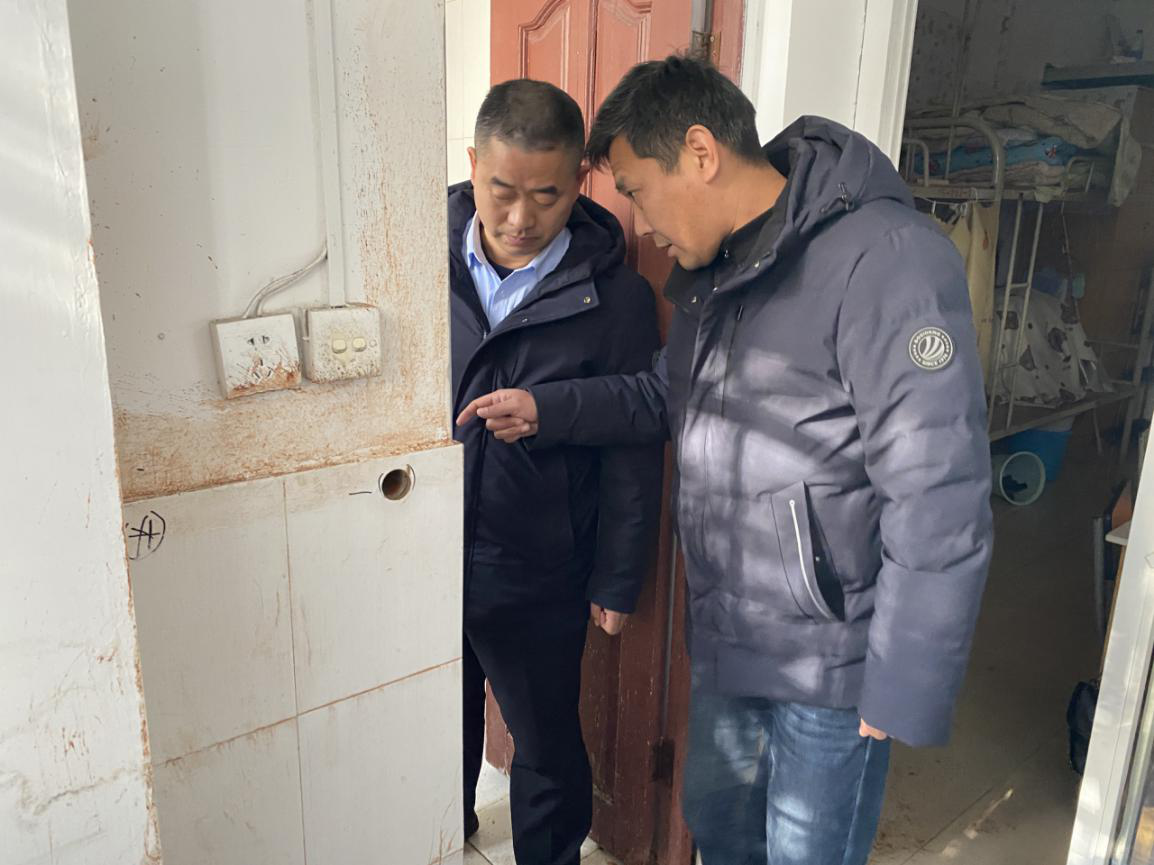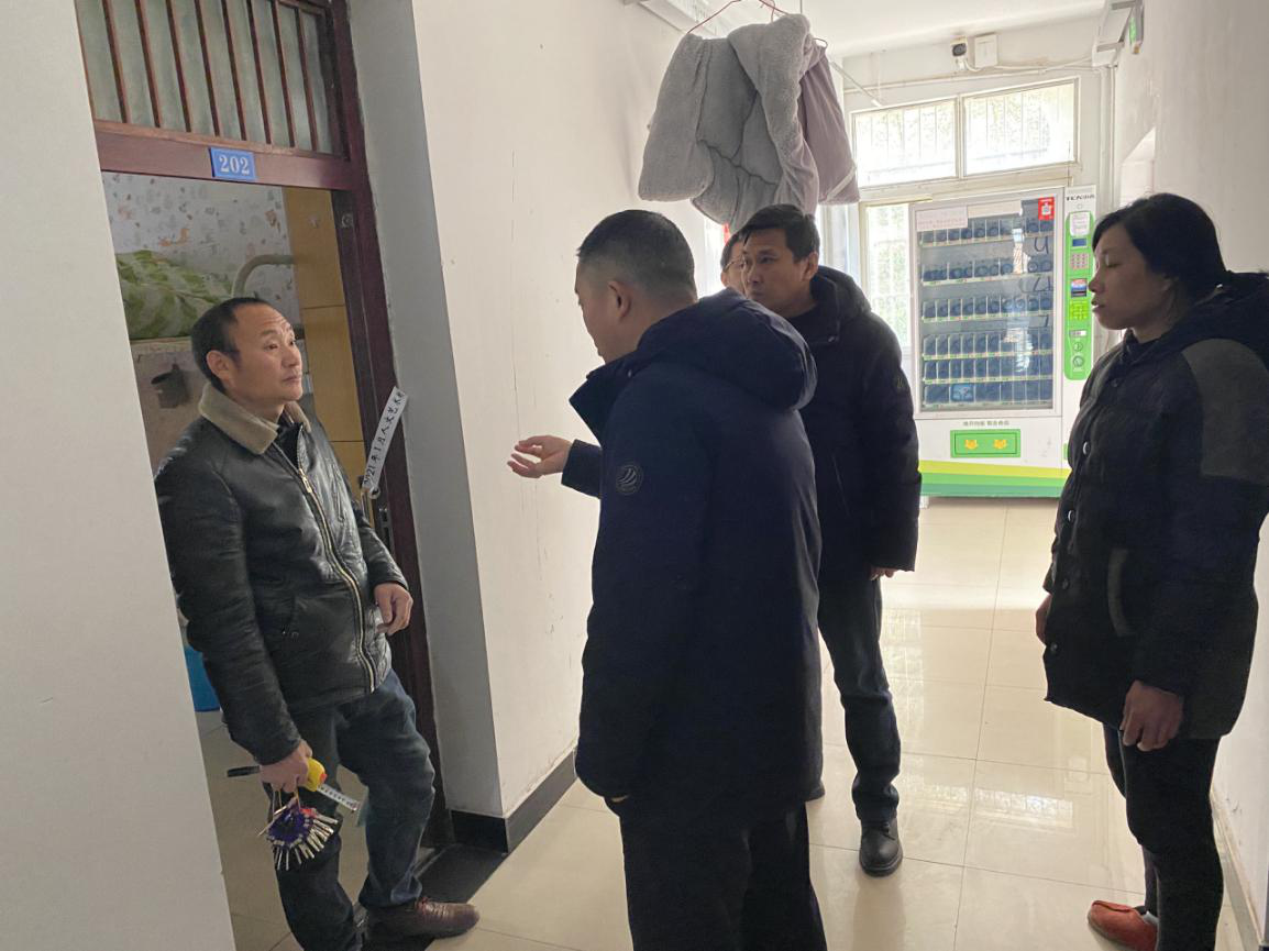 在学生寝室15栋小改造现场,检查人员查看施工现场,了解施工情况,询问施工进度,叮嘱施工人员注意学生物品的安全卫生、要求施工结束后关好水电和门窗。
