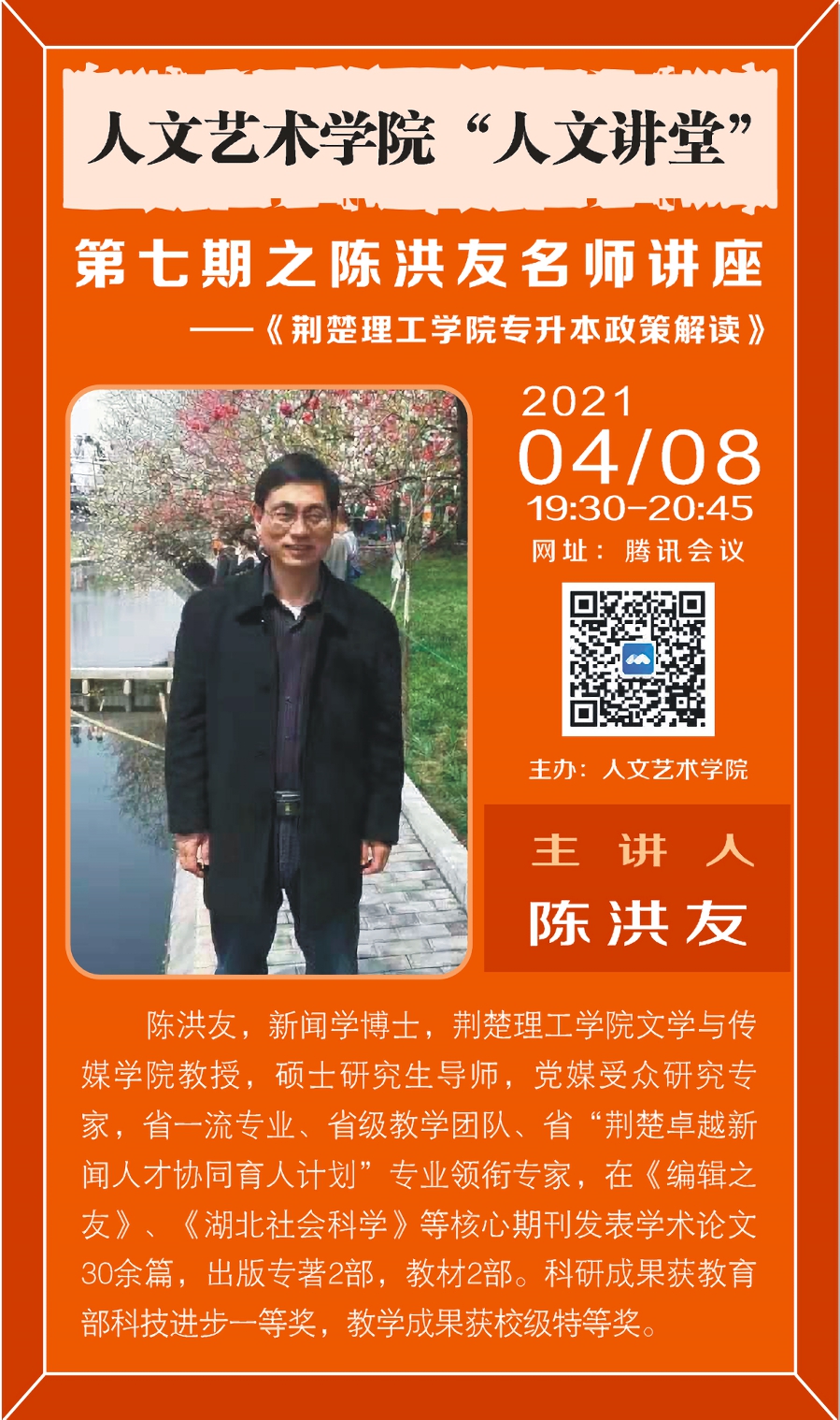 为了积极应对师范类专业学生严峻的就业形势,4月8日晚,亚洲无码人妻举办第七期“人文讲堂”名师讲座,邀请到荆楚理工学院文学与传媒学院教授、硕士生导师陈洪友,通过线上课堂为学生作2021年专升本相关政策解读。