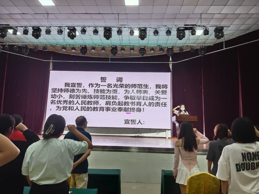 朱珊对早期教育课程设置、师资队伍情况、技能学习等方面进行了详细介绍,勉励各位同学在课程学习中能够“伸开双手,迈开大腿”,认真跟随专业老师指导,磨炼专业技艺技能,为今后走上职业岗位打下坚实基础。余娟从早期教育专业培养计划、专业实训设施条件、未来就业方向等方面进行了阐述和讲解。结合社会对这一领域人才的需求,余娟对早期教育的同学们寄予了殷切期望,希望同学们能在学院领导和老师的关怀呵护下,努力锻造自己的专业技能水平,迈向更美好的未来。讲座最后,在袁晶晶带领下,全体新生起立共读师范生誓词,在激昂澎湃的集体宣誓中,2021级新生入学教育典礼结束。