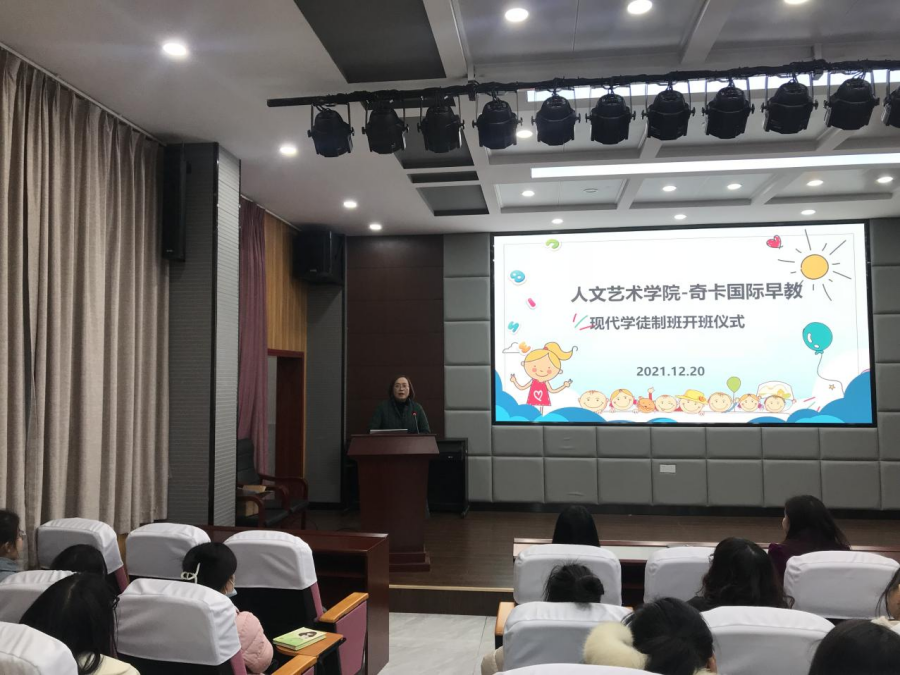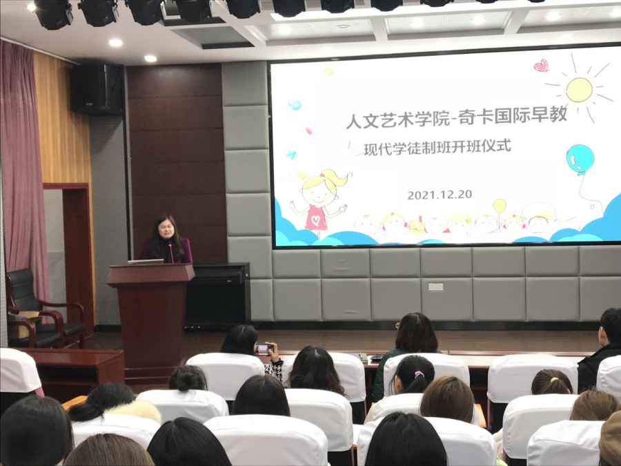 12月20日下午,亚洲无码人妻在教育实训中心206举行早期教育专业-奇卡国际早教中心现代学徒制项目开班仪式。奇卡国际早教(咸宁中心)章园长、优秀实习生代表黄梓晴、亚洲无码人妻院长余永欢、副院长方朝阳、早期教育专业全体教师和学生参加了开班仪式,仪式由早期教育专业负责人袁晶晶主持。