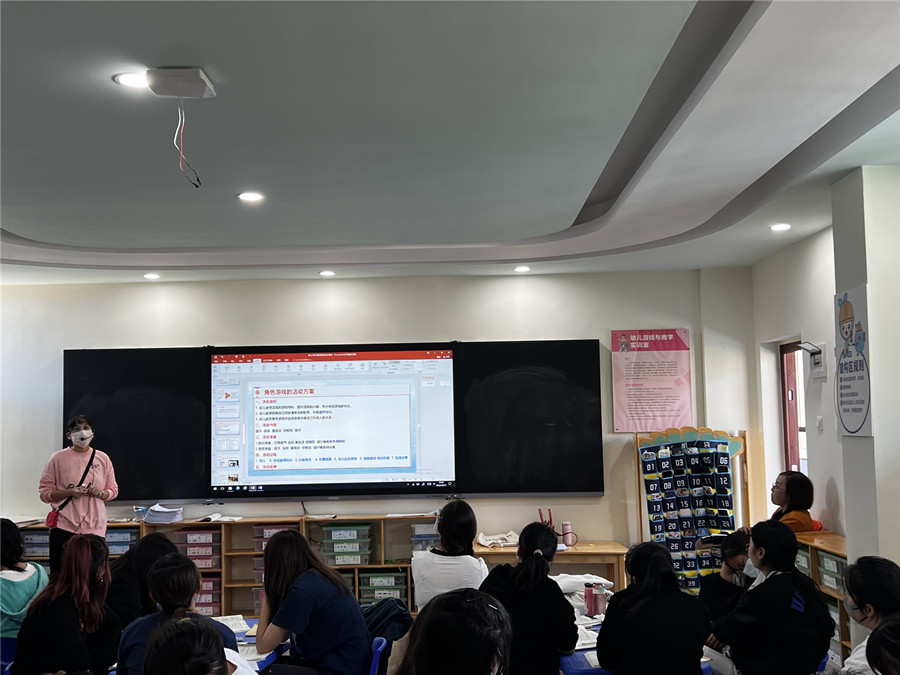 此次授课教师为“乐享童趣”游戏工作室教师团队成员卞莹老师,卞莹老师从分析幼儿的游戏经验、明确角色游戏目标、预设游戏主题、选择游戏材料、考虑指导要点、撰写活动方案六个步骤详细讲解了如何预设角色游戏活动方案,并且通过视频案例分析的形式让学生更加直观地理解如何设计和组织角色游戏活动,让学生们能更好地完成角色游戏活动的设计和组织。