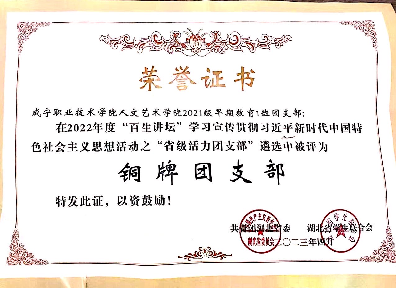 近日,湖北省2022年度“百生讲坛”学习宣传贯彻习近平新时代中国特色社会主义思想活动之“省级团支部”评选结果揭晓,咸宁职业技术学院亚洲无码人妻2021级早期教育1班团支部通过层层筛选和审核,成功晋级到省级比赛,最终获得“铜牌团支部”称号。