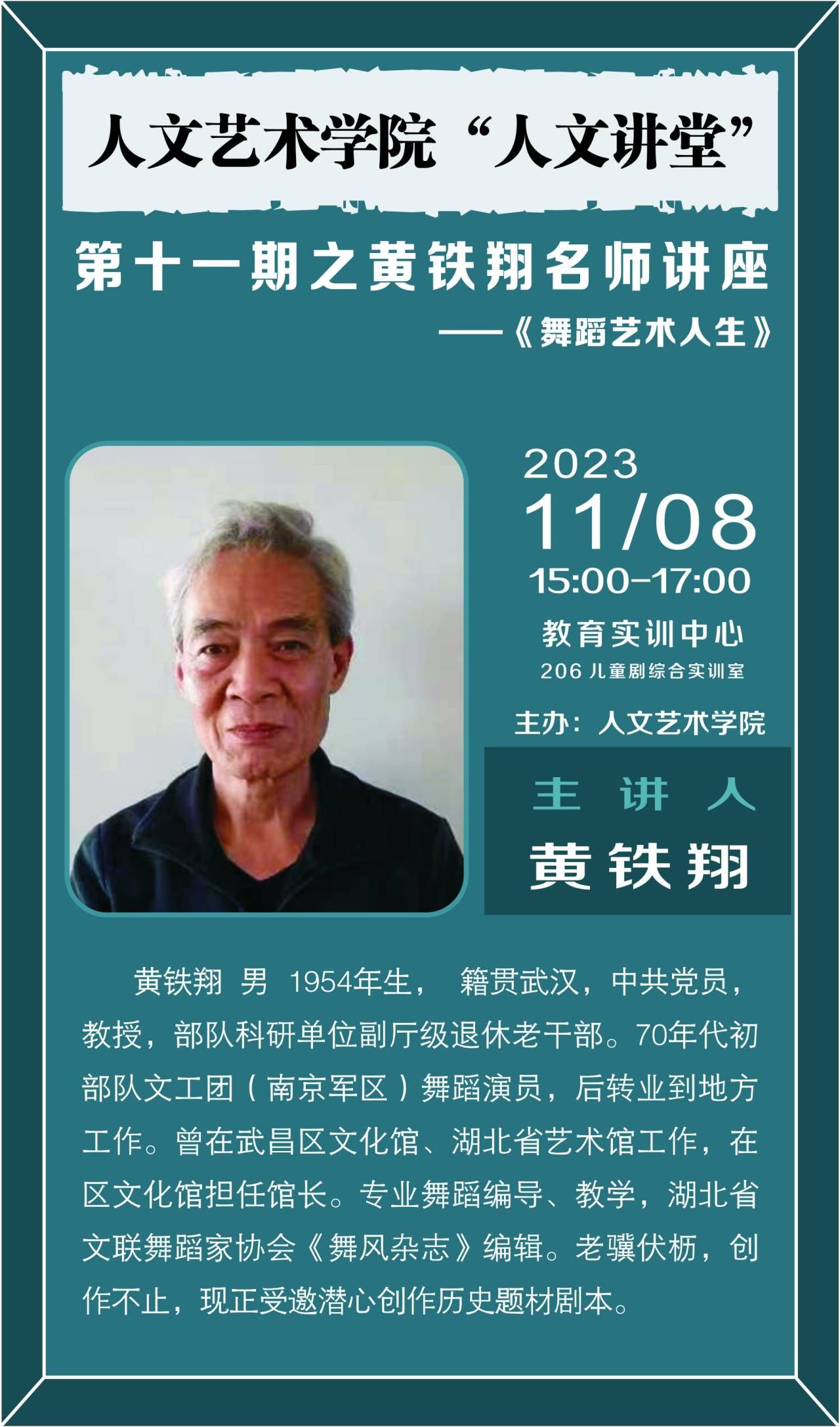 黄铁翔,男,1954年生,籍贯武汉,中共党员,教授,部队科研单位副厅级退休老干部。70年代初部队文工团(南京军区)舞蹈演员,后转业到地方工作。曾在武昌区文化馆、湖北省艺术馆工作,在区文化馆担任馆长。专业舞蹈编导、教学,湖北省文联舞蹈家协会《舞风杂志》编辑。老骥伏枥,创作不止,现正受邀潜心创作历史题材剧本。黄教授讲述的主题是《舞蹈艺术人生》,将自己的舞蹈经历进行用心地讲述。虽然年过七十,但全程一个多小时的讲解黄教授都是站着讲述,诠释了对舞蹈的热爱!