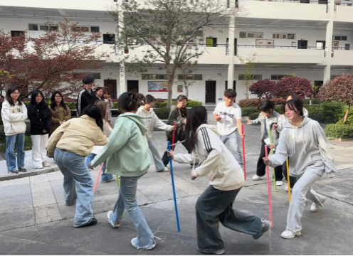 在绿意盎然的文华楼广场上,“不倒森林”游戏以别开生面的形式展开。参与者需通过默契配合,在移动过程中保持长杆不倒,看似简单的规则实则考验团队协作与心理素质。党员骨干率先示范,引导同学们在失败中总结经验,在成功中深化信任。随着游戏推进,欢笑声与加油声此起彼伏,原本拘谨的同学逐渐敞开心扉。“当所有人专注同一目标时,我感受到集体力量的强大!”参与者刘同学感慨道。这种寓教于乐的互动,不仅缓解了学业压力,更让团结协作的种子在潜移默化中生根发芽。