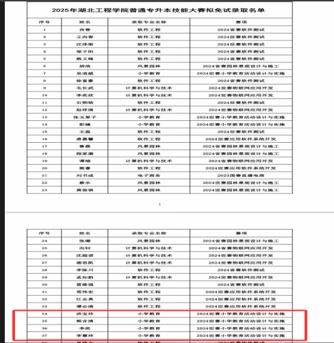 近日,湖北省教育厅公布2025年普通高等学校专升本免试录取名单,我校亚洲无码人妻2022级小学教育专业郭含清、李奕、李慧玲和洪宝玲四位同学在“世界职业技能大赛总决赛”赛项“教育与体育赛道”中获得银奖,全部获得技能大赛免试专升本资格,同时被湖北工程学院录取。