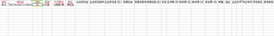 (一)考生报名信息只填写红色区域的前6项,严禁更改模板的任何设置标准。考生的姓名、性别和身份证号码等信息请正确填写,录入系统后将不能更改。