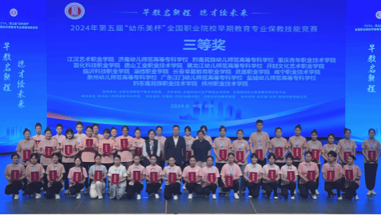 2024年6月2日,由全国学前教育产教合作联盟、全国城市职业教育教学研究协作会主办、郑州幼儿师范高等专科学校承办的2024年第五届“幼乐美杯”全国职业院校早期教育专业保教技能竞赛在河南省郑州市落下帷幕。由唐欢、张子妮、周晴晴三位同学组成的咸宁职业技术学院代表队荣获团体三等奖。